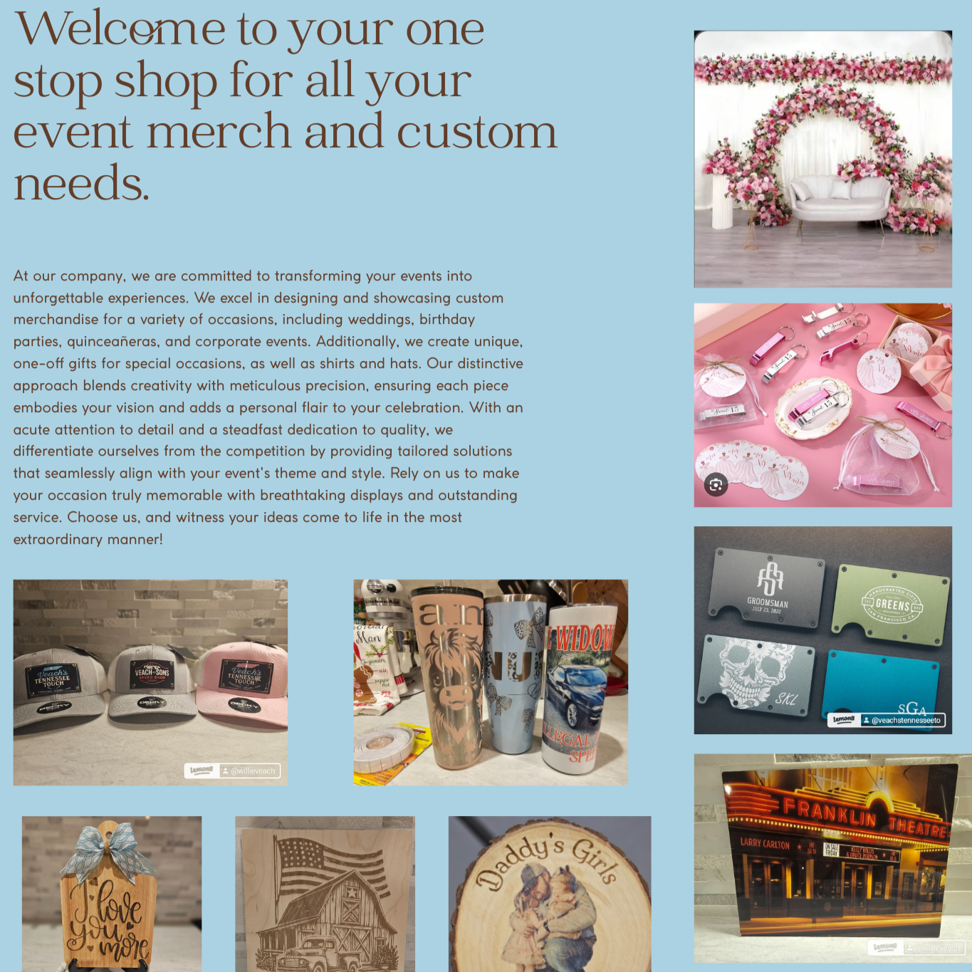 Make your next event unforgettable with custom merchandise from Veach’s Tennessee Touch. We create high-quality, personalized items for weddings, quinceañeras, birthdays, corporate events, and any special occasion throughout Middle Tennessee. From engraved keepsakes and custom gifts to branded party favors and themed décor, each piece is tailored to your vision, color palette, and budget.
